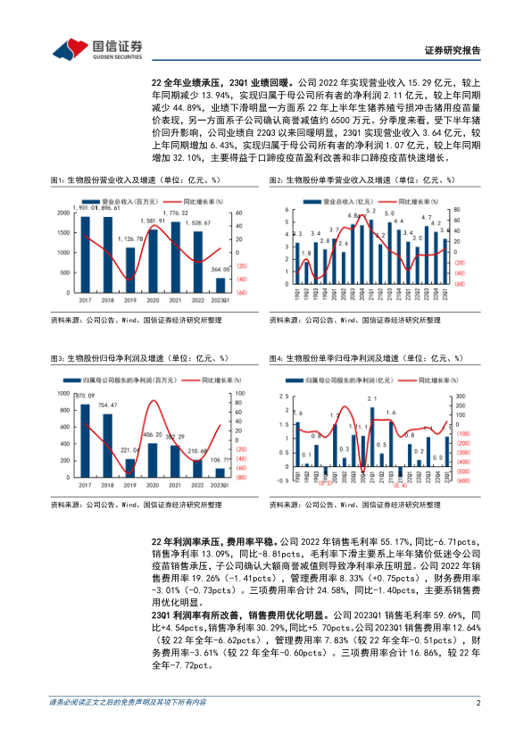 生物股份在2022年经历了业绩承压,营业收入和归母净利润分别同比下降13.94%和44.89%,主要受生猪养殖亏损和商誉减值影响。然而,公司业绩自2022年第三季度开始回暖,并在2023年第一季度实现营业收入同比增长6.43%,归母净利润同比增长32.10%,这得益于口蹄疫疫苗盈利改善和非口蹄疫疫苗的快速增长。在利润率方面,2022年毛利率和净利率均有所下滑,但2023年第一季度已显著改善,销售费用优化明显。资产周转方面,2022年保持平稳,但2023年第一季度存货和应收账款周转天数增加,经营现金流转负。公司持续加大研发投入,2022年研发费用占营收13.30%,非洲猪瘟亚单位疫苗已提交应急评审,多联多价疫苗和宠物疫苗业务也取得积极进展,并通过营销体系变革寻求新的增长点。国信证券维持“买入”评级,看好公司中期业绩修复和长期非瘟疫苗研发带来的成长潜力,并预测2023-2025年归母净利润将实现增长。