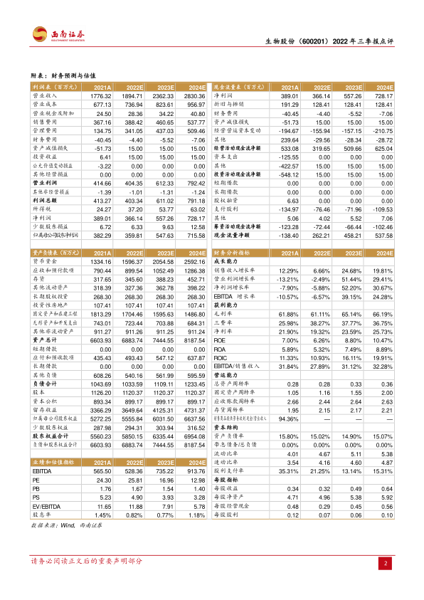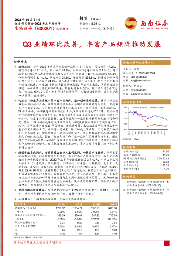 生物股份在2022年前三季度业绩虽受市场环境影响同比下滑,但第三季度已展现出强劲的环比复苏态势,主要得益于下游养殖业的回暖。公司凭借以口蹄疫疫苗为核心的多元化产品矩阵、持续的研发创新投入(尤其在非洲猪瘟疫苗领域),以及适应市场需求的“组合免疫”和“无针注射”等策略,有效巩固并拓展了市场份额。随着规模化养殖的普及和养殖企业盈利能力的提升,动物保健品需求将持续增长,为生物股份未来的业绩增长提供有力支撑。基于当前市场分析和公司发展潜力,报告维持“持有”的投资评级,并提示了下游需求和产品研发不及预期的风险。