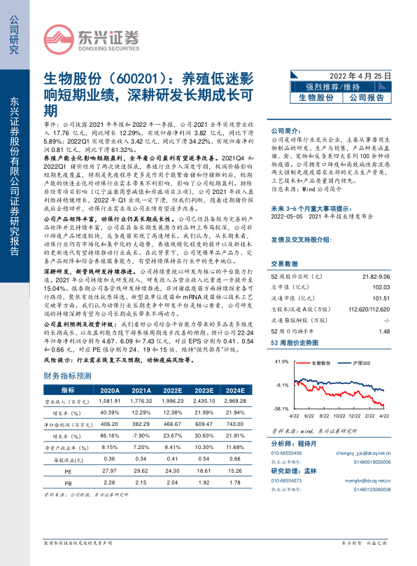 本报告认为,生物股份短期业绩受到养殖行业低迷的影响,但公司通过深耕研发,不断丰富产品矩阵,并凭借动保行业的长期成长性,未来仍具备较强的增长潜力。维持“强烈推荐”评级。