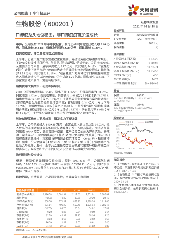 生物股份在2021年上半年实现了显著的业绩增长,营业收入和归母净利润分别同比增长34.61%和41.38%。公司在口蹄疫疫苗市场保持稳固地位,并通过“先打后补”政策和“组合免疫”方案有效推动了口蹄疫疫苗均价提升和非口蹄疫猪用疫苗的加速成长。尽管销售费用因市场推广策略大幅增加,但公司整体净利率仍有所回升。此外,公司持续加大研发投入,在非洲猪瘟疫苗等前沿领域取得积极进展,并有多款新型疫苗获得批件,宠物疫苗业务也稳步推进,为未来发展奠定基础。分析师维持“买入”评级,并预计公司未来几年将保持强劲的盈利增长。