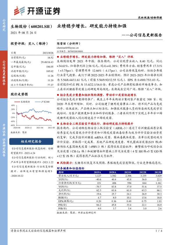 生物股份发布 2021 年中报:报告期内,公司实现营业收入 8.40 亿元,同比+34.61%,归母净利润 2.58 亿元,同比+41.38%;费用率方面,销售费用率 17.31%( +3.75pct),管理费用率 12.66%( -4.17pct)。公司业绩恢复向好, 但结合养殖行业景气趋势,我们下调 2022-2023 年业绩预测,预计 2021-2023 年归母净利润为 5.56/8.44/11.61 亿元(前值 5.56/9.92/12.55 亿元), EPS 为 0.49/0.75/1.03 元,当前股价对应 PE 为 33.4/22.1/16.0 倍,考虑公司产品拥有较强的市场竞争力,加上在非洲猪瘟等疫苗上的研发布局领先, 长期成长空间广阔,维持“买入”评级。