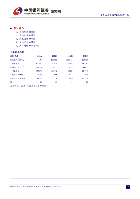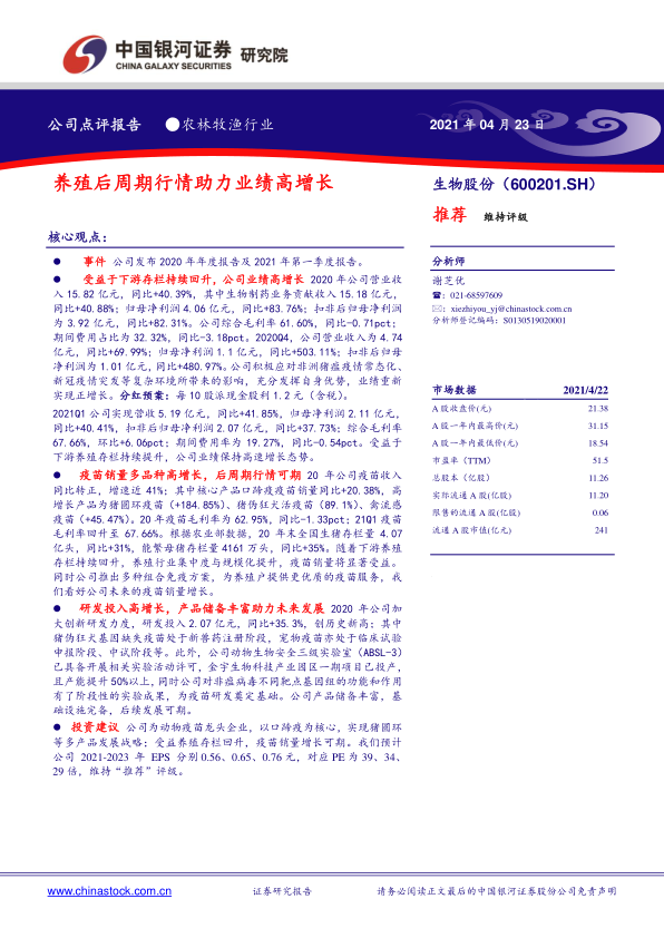 投资建议公司为动物疫苗龙头企业,以口蹄疫为核心,实现猪圆环等多产品发展战略;受益养殖存栏回升,疫苗销量增长可期。我们预计公司2021-2023年EPS分别0.56、0.65、0.76元,对应PE为39、34、29倍,维持“推荐”评级。