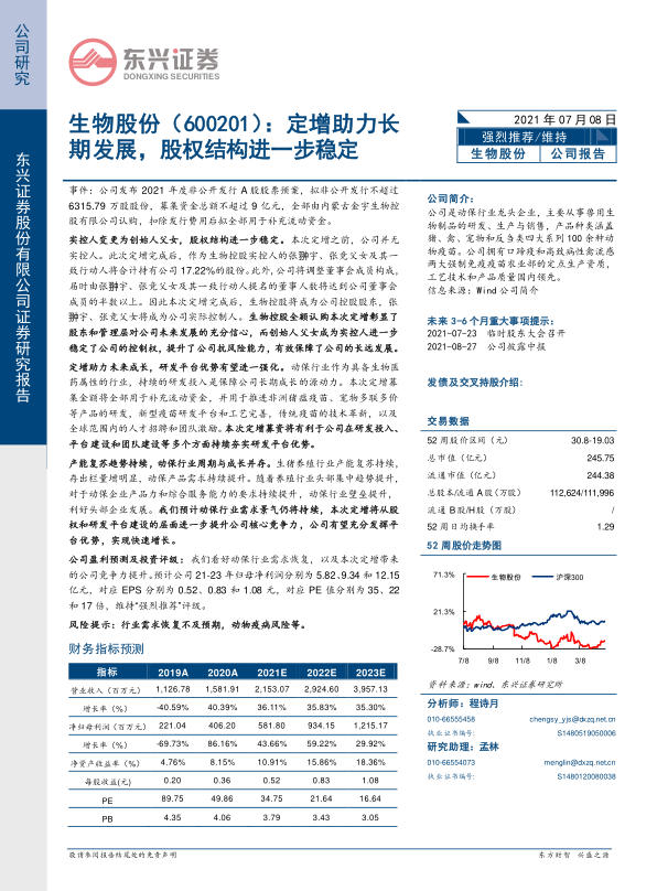 看好动保行业需求恢复,以及本次定增带来的公司竞争力提升。预计公司21-23年归母净利润分别为5.82、9.34和12.15亿元,对应EPS分别为0.52、0.83和1.08元,对应PE值分别为35、22和17倍,维持“强烈推荐”评级。