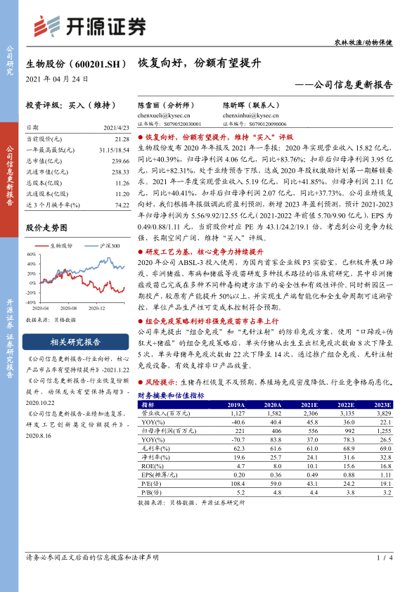 生物股份发布 2020 年年报及 2021 年一季报: 2020 年实现营业收入 15.82 亿元,同比+40.39%, 归母净利润 4.06 亿元,同比+83.76%; 扣非后归母净利润 3.95 亿元,同比+82.31%,处于业绩预告下限, 达成 2020 年股权激励计划第一期解锁要求。 2021 年一季度实现营业收入 5.19 亿元,同比+41.85%,归母净利润 2.11 亿元,同比+40.41%,扣非后归母净利润 2.07 亿元,同比+37.73%。 公司业绩恢复向好, 我们根据年报微调此前盈利预测, 新增 2023 年盈利预测, 预计 2021-2023年归母净利润为 5.56/9.92/12.55 亿元( 2021-2022 年前值 5.70/9.90 亿元), EPS 为0.49/0.88/1.11 元,当前股价对应 PE 为 43.1/24.2/19.1 倍,考虑到公司竞争力较强,长期空间广阔, 维持“买入”评级。