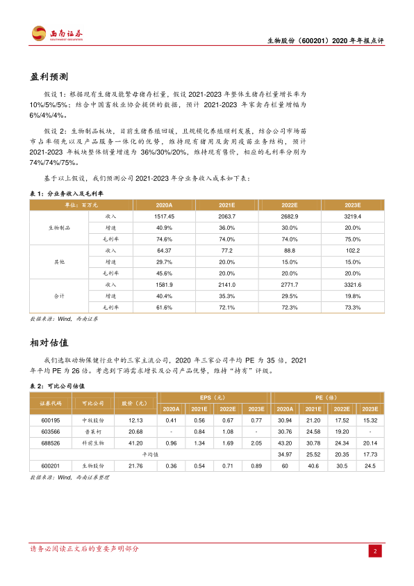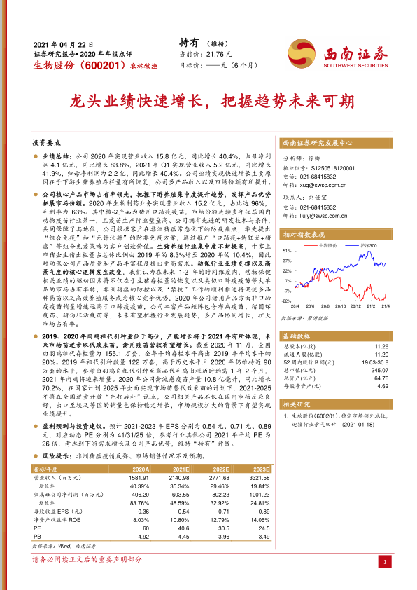 本报告通过对生物股份2020年年报的详细解读,揭示了公司业绩快速增长的原因,并分析了公司在市场竞争中的优势地位。报告还对禽用疫苗市场的发展前景进行了展望,并给出了盈利预测和投资建议。总体而言,生物股份作为动物疫苗行业的龙头企业,有望在行业发展趋势中把握机遇,实现业绩的持续增长。