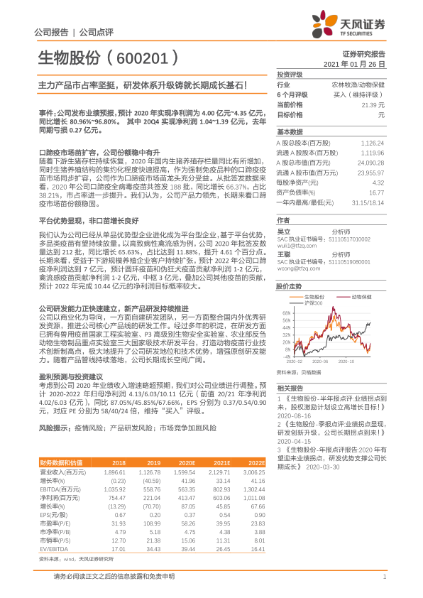 我们认为公司已经从单品优势型企业进化成为平台型企业,基于平台优势,多品类疫苗有望持续放量。以高致病性禽流感为例,公司 2020 年批签发数量达到 212 批,同比增长 65.63%,占比达到 11.88%,提升 4.61 个百分点。长期来看,受益于下游规模养殖企业客户持续扩张,预计 2022 年公司口蹄疫净利润达到 7 亿元,预计圆环疫苗和伪狂犬疫苗贡献净利润 1-2 亿元,禽流感疫苗贡献净利润 1-2 亿元,中枢 3 亿元,叠加公司其他疫苗的贡献,预计 2022 年完成 10.44 亿元的净利润目标概率较大。