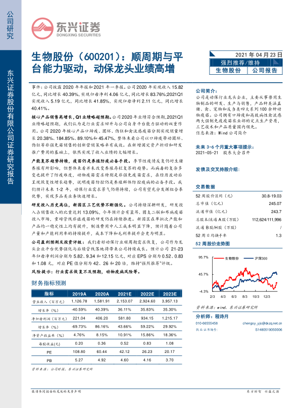 本报告分析了生物股份(600201)2020年年报和2021年一季报,指出公司业绩增长受益于行业顺周期和自身平台能力,核心产品销量大幅增长,研发投入持续增加,新园区工艺优势明显。预计未来1-2年动保行业景气度将持续,公司有望实现多品类业务快速增长。维持“强烈推荐”评级,但需注意行业需求恢复不及预期和动物疫病风险。