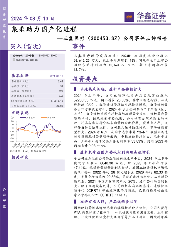 公司在2024年3月参与二十三省(区、兵团)血液透析类医用耗材省际联盟带量采购,透析器和管路均中标,并具备参与待分配采购量的资格。截至上半年,大部分省份已陆续执行,公司收入保持快速增长,市场份额有望扩大。2024年6月,公司中选京津冀“3+N”联盟血液透析类医用耗材带量联动采购,中标省份持续扩大。上半年血液净化类业务毛利率为33.89%,同比上升2.03个百分点。