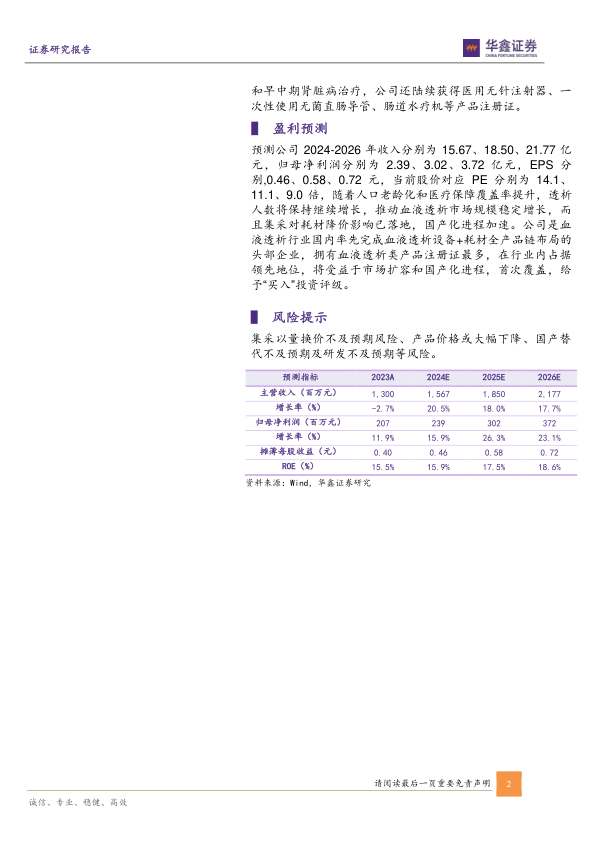 公司围绕晚期肾脏病透析患者内瘘保护,已获得PTA高压球囊扩张导管、一次性使用透析用留置针、血管鞘组、一次性使用球囊扩充压力泵等产品注册证。同时,围绕糖尿病和早中期肾脏病治疗,公司还陆续获得医用无针注射器、一次性使用无菌直肠导管、肠道水疗机等产品注册证,稳步拓宽产品线。分析师预测公司2024-2026年收入分别为15.67亿元、18.50亿元、21.77亿元,归母净利润分别为2.39亿元、3.02亿元、3.72亿元,当前股价对应PE分别为14.1、11.1、9.0倍。随着人口老龄化和医疗保障覆盖率提升,透析人数将保持继续增长,推动血液透析市场规模稳定增长,且集采对耗材降价影响已落地,国产化进程加速。公司作为血液透析行业国内率先完成血液透析设备+耗材全产品链布局的头部企业,将受益于市场扩容和国产化进程,首次覆盖给予“买入”投资评级。