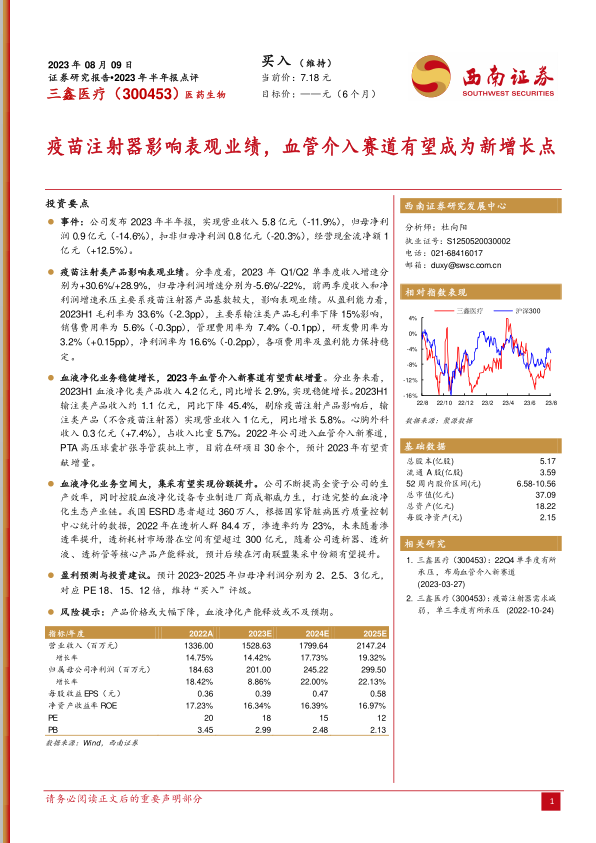 本报告对三鑫医疗2023年半年报进行了详细分析,指出公司业绩受到疫苗注射器产品的影响,但血液净化业务稳健增长,血管介入新赛道有望成为新的增长点。维持对公司“买入”评级,并提示了相关风险。