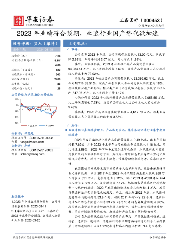 三鑫医疗2023年业绩符合预期,血液净化业务稳步增长,受益于血透耗材集采落地和国产替代加速。公司积极拓展肾脏病全周期医疗器械产业布局,未来增长潜力可期。维持“买入”评级,但需关注血透设备销售不及预期和集采导致产品价格大幅下降的风险。