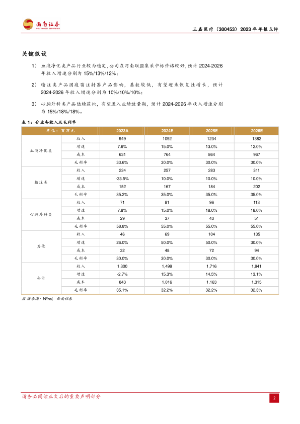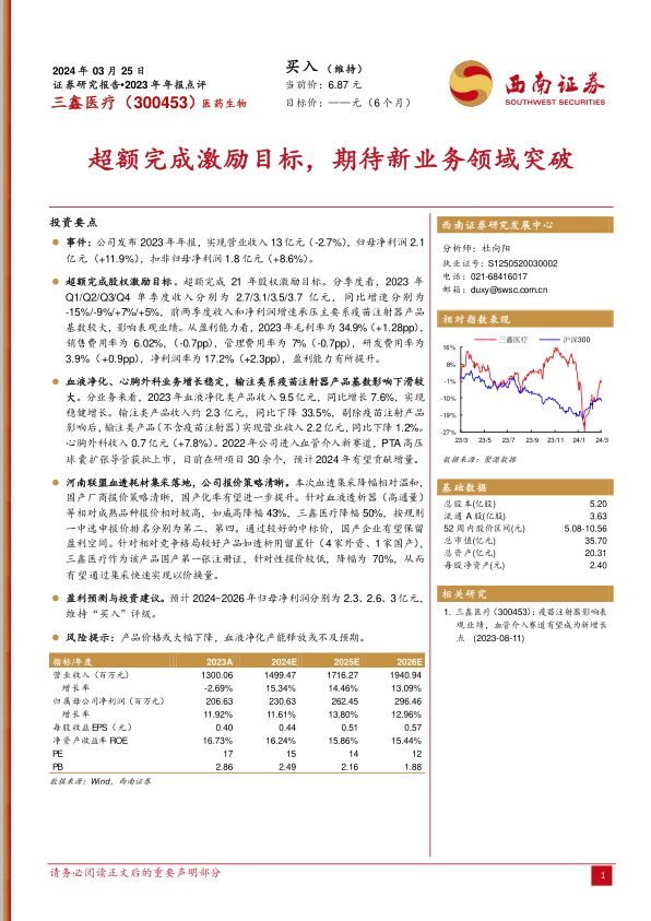 本报告全面分析了三鑫医疗2023年年报,认为公司超额完成激励目标,血液净化业务稳健增长,心胸外科业务有望进入放量期,血管介入新赛道值得期待。公司在河南联盟血透耗材集采中采取了清晰的报价策略,有望通过集采实现以价换量,提升国产化率。基于以上分析,报告预计公司未来业绩将持续增长,维持“买入”评级,但同时也提示了产品价格下降和产能释放不及预期的风险。