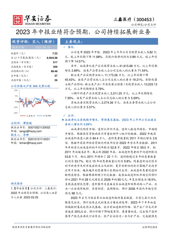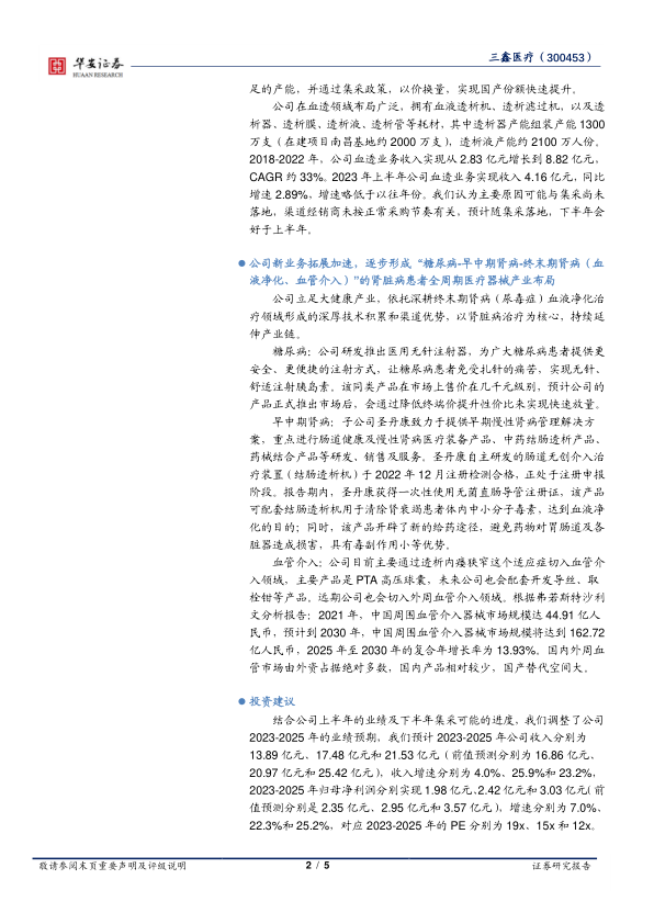 本报告对三鑫医疗2023年中报进行了详细分析,认为公司业绩符合预期,血液净化业务稳步增长,新业务拓展加速,维持“买入”评级。同时,报告也提示了血透设备销售不及预期和集采导致产品价格大幅下降的风险。