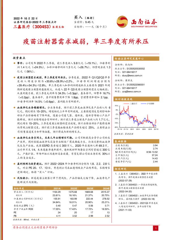 本报告分析了三鑫医疗2022年三季报,指出公司业绩受到疫苗注射器需求减弱的影响,但血液净化业务和输血输液类产品表现良好,未来增长潜力巨大。考虑到公司在血透领域的长期布局和市场前景,维持“买入”评级,但需关注相关风险。
