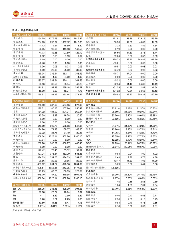 本报告对三鑫医疗(300453)2022年三季报进行了分析,核心观点如下: