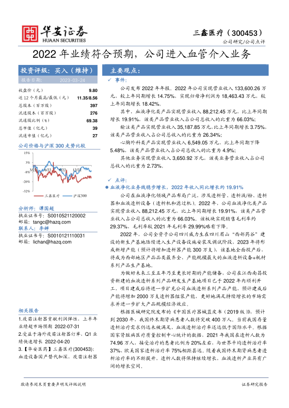 三鑫医疗2022年业绩符合预期,血液净化业务稳健增长,同时积极拓展血管介入业务,有望打开新的增长空间。公司在血液净化领域具有较强的竞争优势,且受益于国产替代趋势。维持“买入”评级,但需关注血透设备销售、原材料价格和集采等风险。