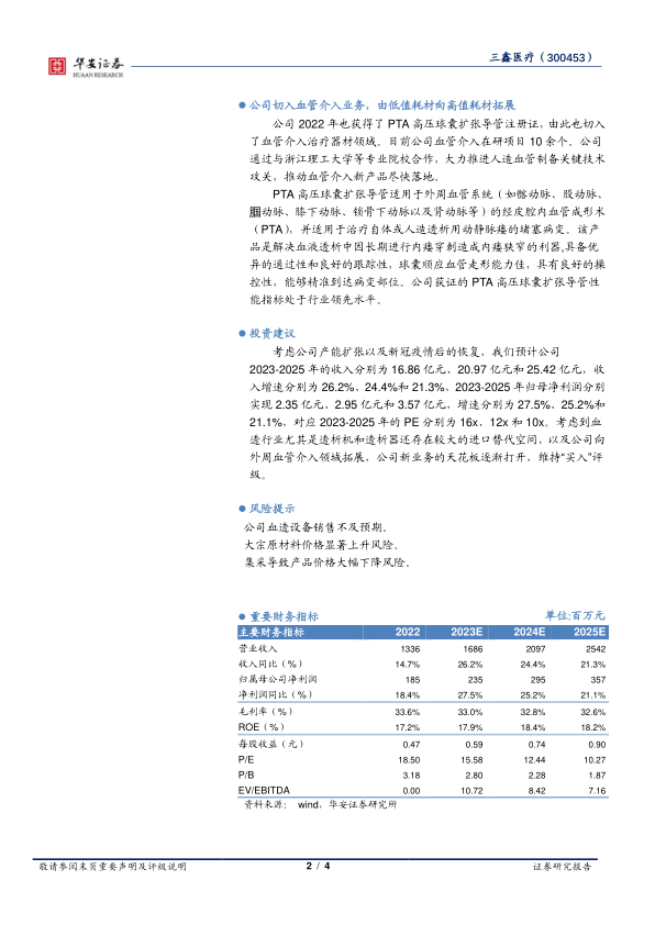 考虑公司产能扩张以及新冠疫情后的恢复,我们预计公司2023-2025年的收入分别为16.86亿元、20.97亿元和25.42亿元,收入增速分别为26.2%、24.4%和21.3%,2023-2025年归母净利润分别实现2.35亿元、2.95亿元和3.57亿元,增速分别为27.5%、25.2%和21.1%,对应2023-2025年的PE分别为16x、12x和10x。考虑到血透行业尤其是透析机和透析器还存在较大的进口替代空间,以及公司向外周血管介入领域拓展,公司新业务的天花板逐渐打开,维持“买入”评级。