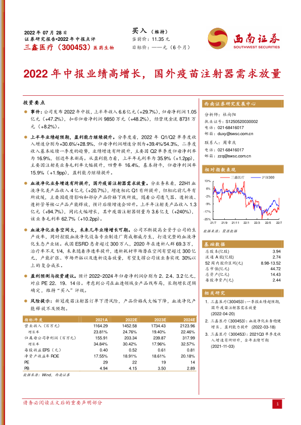 本报告对三鑫医疗2022年中报进行了深入分析,公司上半年业绩表现亮眼,盈利能力持续提升,国外疫苗注射器需求是主要增长驱动力。血液净化业务虽然增速有所放缓,但长期来看,市场空间广阔,增长潜力巨大。维持对公司“买入”评级,但需关注新冠疫苗注射器订单下滑、产品价格下降以及血液净化产能释放不及预期等风险。