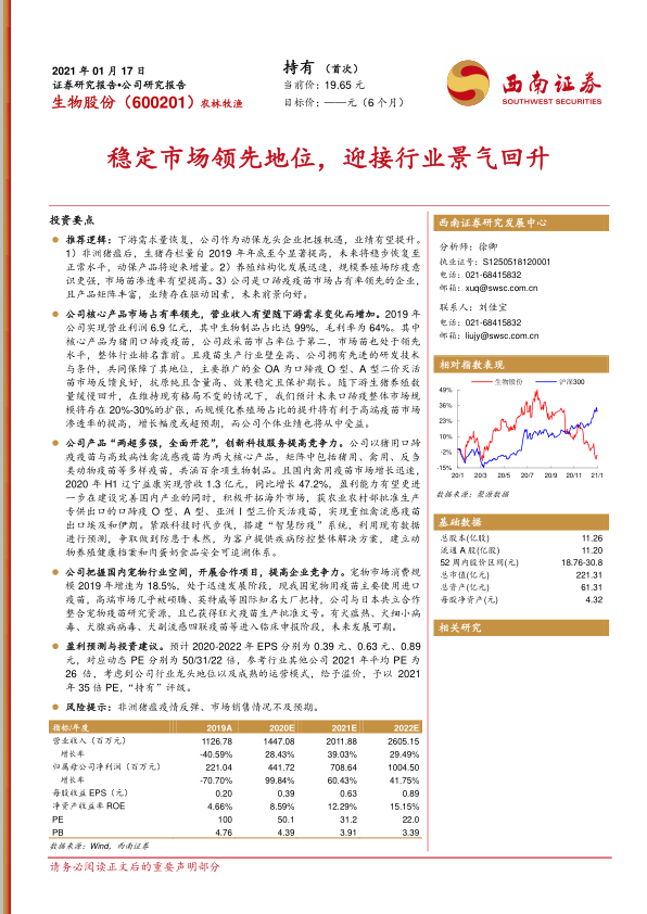 公司把握国内宠物行业空间,开展合作项目,提高企业竞争力。宠物市场消费规模2019年增速为18.5%,处于迅速发展阶段,现我国宠物用疫苗主要使用进口疫苗,高端市场几乎被硕腾、英特威等国际知名大厂把持,公司与日本共立合作整合宠物疫苗研究资源,且已获得狂犬疫苗生产批准文号。有犬瘟热、犬细小病毒、犬腺病病毒、犬副流感四联疫苗等进入临床申报阶段,未来发展可期。盈利预测与投资建议。预计2020-2022年EPS分别为0.39元、0.63元、0.89元,对应动态PE分别为50/31/22倍,参考行业其他公司2021年平均PE为26倍,考虑到公司行业龙头地位以及成熟的运营模式,给予溢价,予以2021年35倍PE,“持有”评级。