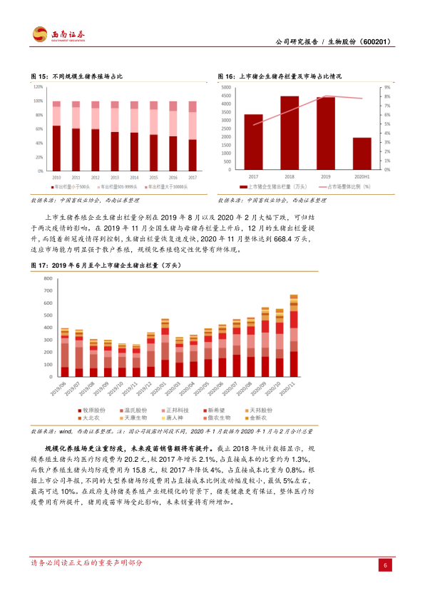 规模化养殖场更注重防疫投入,这将显著提升疫苗销售额。截至2018年的统计数据显示,规模养殖生猪头均医疗防疫费为20.2元,较2017年增长2.1%,占直接成本的比重约为1.3%。相比之下,散户养殖生猪头均防疫费用为15.8元,较2017年降低4%,占直接成本比重为0.8%。根据上市公司年报,不同大型养猪场的防疫费用占直接成本的比例波动幅度较小,最低约5%,最高可达10%。在政府支持猪类养殖产业规模化的背景下,猪类健康保障得到加强,整体医疗防疫费用有所提升,猪用疫苗市场受此影响,未来销量将有所增加。