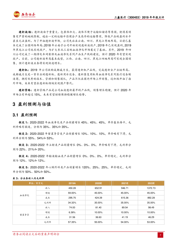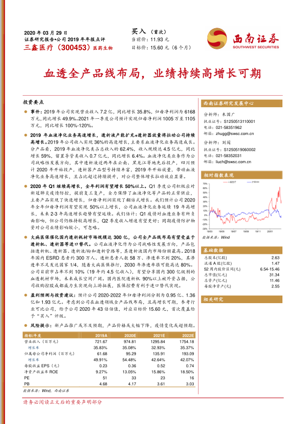 根据盈利预测,公司未来三年将继续保持高速增长,预计2020-2022年归母净利润将从0.95亿元增长至1.93亿元。基于公司在血透领域的全产品线优势和高增长潜力,报告给予“买入”评级,目标价15.60元。然而,投资者仍需关注新产品推广不及预期、产品价格大幅下降以及疫情变化等潜在风险。