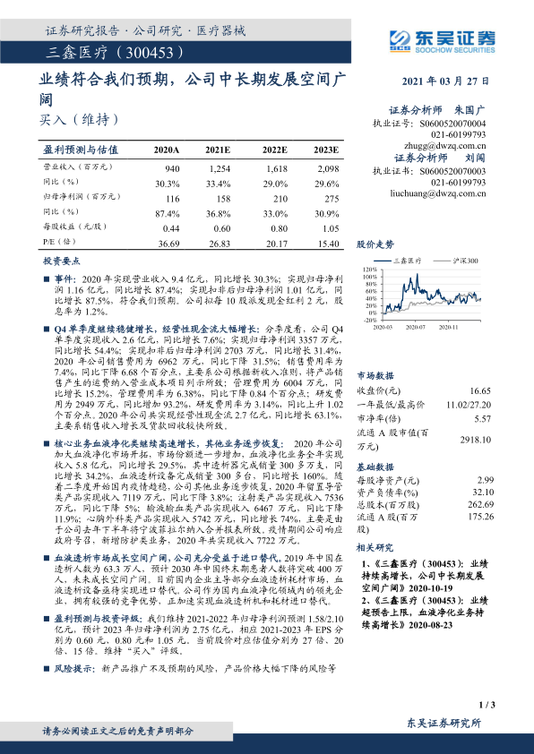三鑫医疗2020年业绩表现强劲,营业收入和归母净利润均实现高速增长,符合市场预期。公司核心的血液净化业务是主要增长引擎,通过加大市场开拓和产品销售,市场份额持续扩大。尽管部分传统业务受疫情影响略有下滑,但心胸外科业务因并购实现显著增长,且公司积极拓展防护类新业务。展望未来,中国血液透析市场潜力巨大,三鑫医疗作为行业领先者,有望充分受益于进口替代趋势,实现中长期持续发展。基于稳健的业绩表现和广阔的市场前景,分析师维持了公司的“买入”评级。