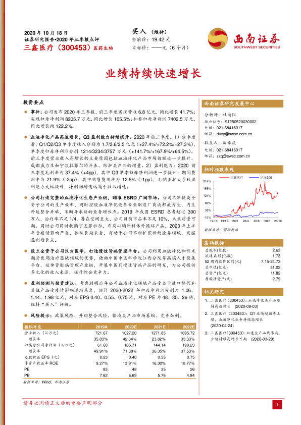三鑫医疗在2020年前三季度展现出强劲的业绩增长势头,营收和净利润均实现高速增长,尤其在血液净化产品领域表现突出,盈利能力显著提升。公司通过战略性并购和产业链延伸,积极布局广阔的ESRD市场,并创新性地设立慢性肾病管理平台,为未来发展奠定基础。尽管存在政策、并购整合及市场竞争等风险,但基于其核心业务的增长潜力和战略布局,公司未来业绩增长可期,维持“买入”评级。
