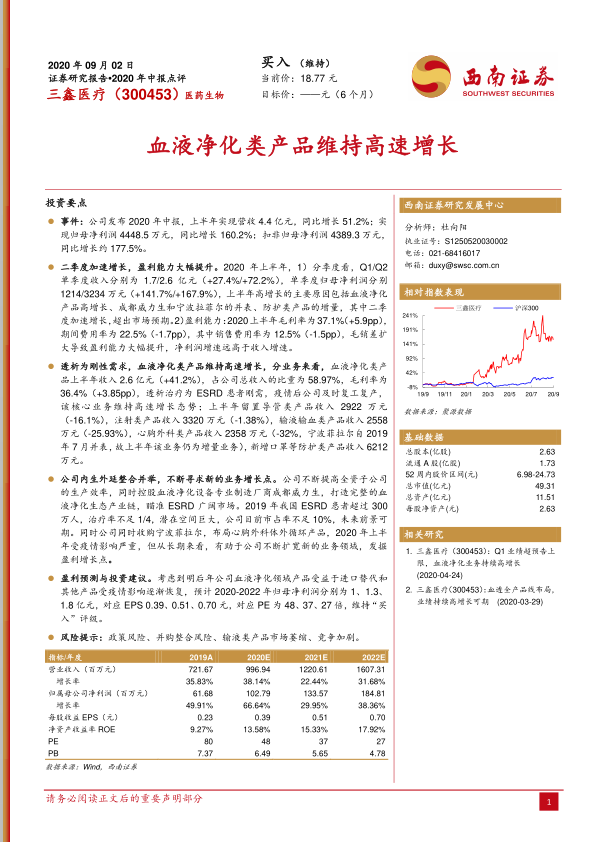 三鑫医疗2020年上半年表现出强劲的增长势头,营收和净利润均实现大幅增长,主要得益于其核心血液净化业务的高速发展、成功的并购整合以及防护类产品的贡献。公司在ESRD这一巨大且未充分开发的市场中占据有利地位,并通过内生外延战略持续拓展业务边界。尽管面临政策、整合及市场竞争等风险,但鉴于其在血液净化领域的全产业链布局和进口替代的趋势,公司未来盈利增长潜力显著,维持“买入”评级。