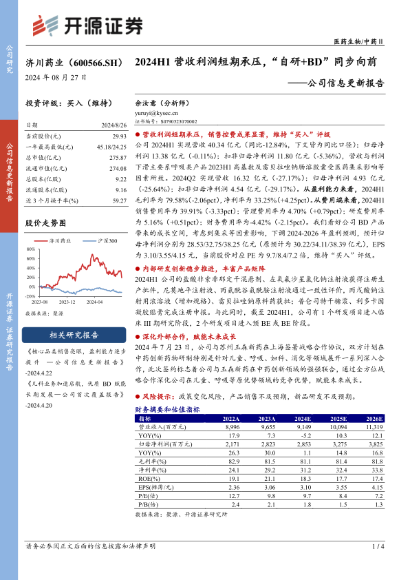 公司2024H1实现营收40.34亿元(同比-12.84%,下文皆为同比口径);归母净利润13.38亿元(-0.11%);扣非归母净利润11.80亿元(-5.36%),营收与利润下滑主要系呼吸类产品2023H1高基数及雷贝拉唑钠肠溶胶囊受医药集采影响等因素所致。2024Q2实现营收16.32亿元(-27.17%);归母净利润4.93亿元(-25.64%);扣非归母净利润4.54亿元(-29.17%)。从盈利能力来看,2024H1毛利率为79.58%(-2.06pct),净利率为33.25%(+4.25pct)。从费用端来看,2024H1销售费用率为39.91%(-3.33pct);管理费用率为4.70%(+0.79pct);研发费用率为5.16%(+0.51pct);财务费用率为-4.42%(-2.15pct)。我们看好公司BD产品带来的成长空间,考虑到集采等因素影响,下调2024-2026年盈利预测,预计归母净利润分别为28.53/32.75/38.25亿元(原预计为30.22/34.11/38.39亿元),EPS为3.10/3.55/4.15元,当前股价对应PE为9.7/8.4/7.2倍,维持“买入”评级。