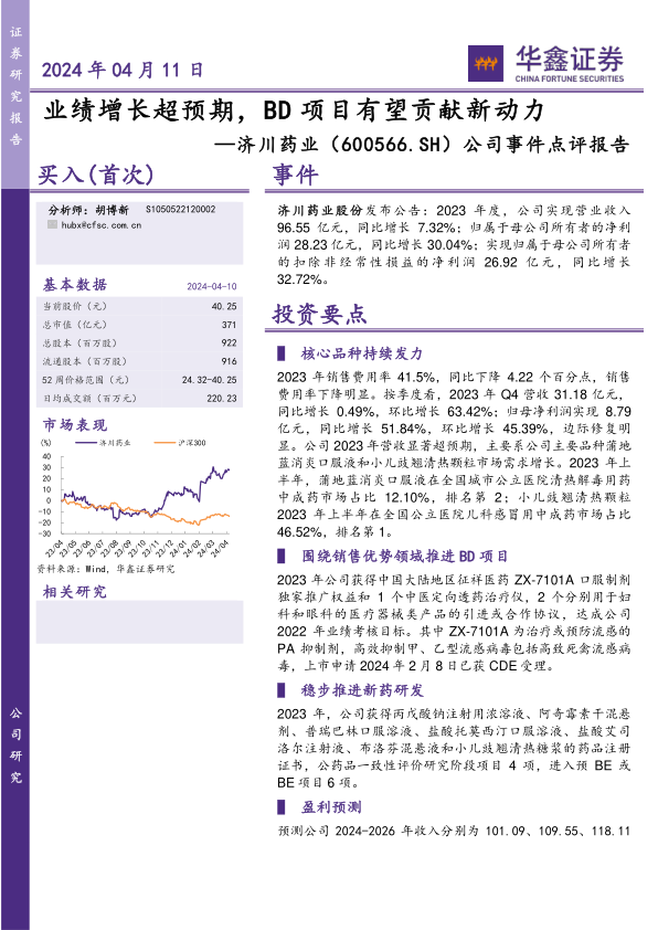 济川药业2023年业绩表现亮眼,核心品种市场表现强劲,BD项目和新药研发稳步推进。