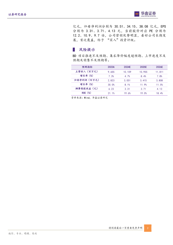 首次覆盖,给予“买入”投资评级,但需关注BD项目推进、集采降价、上市进度和销售等风险。