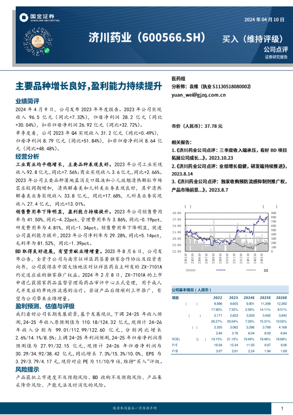 我们看好公司长期发展前景,基于发展现状,下调24-25年收入预测,24-25年收入原预测值为110.18/124.32亿元,现预计24-26年收入分别为99.01/112.99/122.60亿元,分别同比增长2.6%/14.1%/8.5%;上调24-25年利润预测,24-25年归母净利润原预测值为27.91/32.15亿元,现预计24-26年归母净利润为30.29/34.92/38.42亿元,同比增长7.3%/15.3%/10.0%,EPS为3.29/3.79/4.17元,现价对应PE为11/10/9倍,维持“买入”评级。