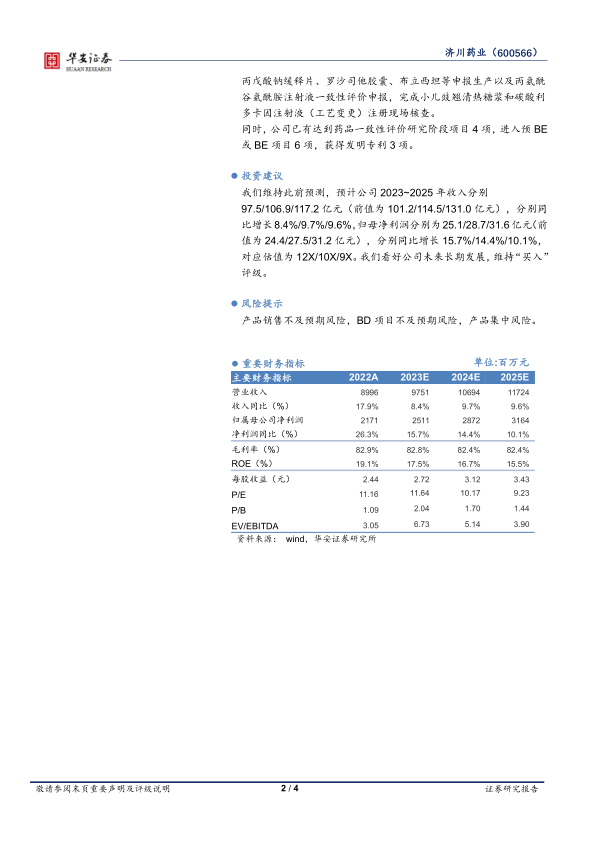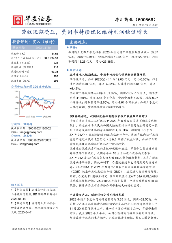 济川药业2023年前三季度业绩稳健增长,但三季度收入略有回调。公司通过费用优化保障利润增长,并积极推进BD合作和研发投入,为未来发展提供动力。华安证券维持对公司“买入”评级,但同时也提示了相关风险。