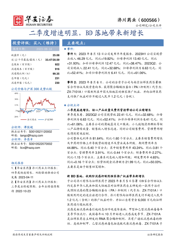 本报告对济川药业2023年半年度报告及近期业务发展进行了分析,核心观点如下: