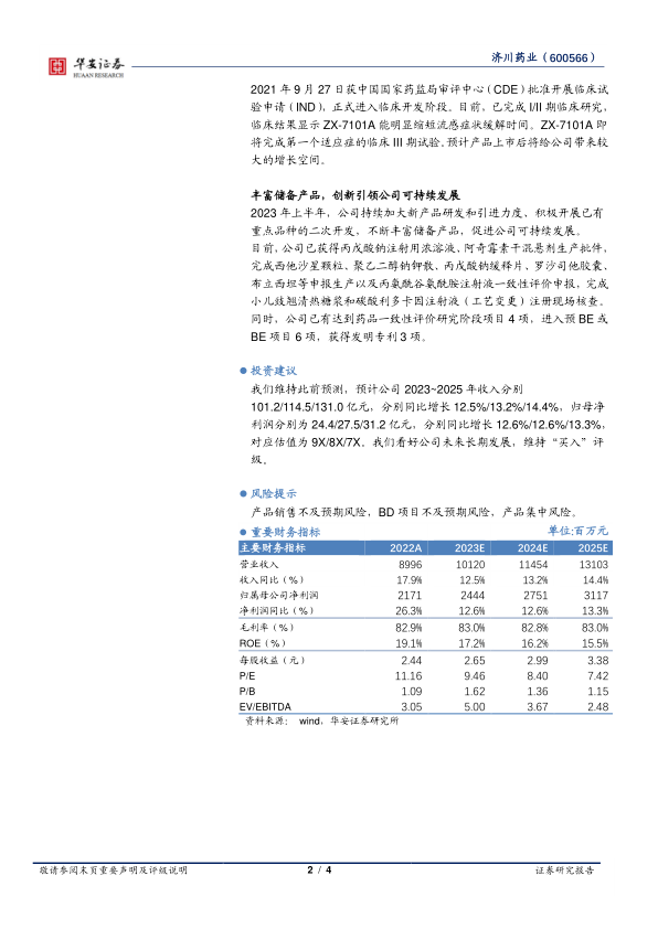 济川药业2023年上半年业绩表现亮眼,核心产品销售增长强劲,费用管控有效。公司积极拓展新业务,通过BD合作引入流感抑制剂,有望为未来增长注入新动力。同时,公司持续加大研发投入,丰富产品储备,为可持续发展奠定基础。华安证券维持对济川药业的“买入”评级,看好其长期发展前景。但投资者也应关注产品销售、BD项目及产品集中等风险。