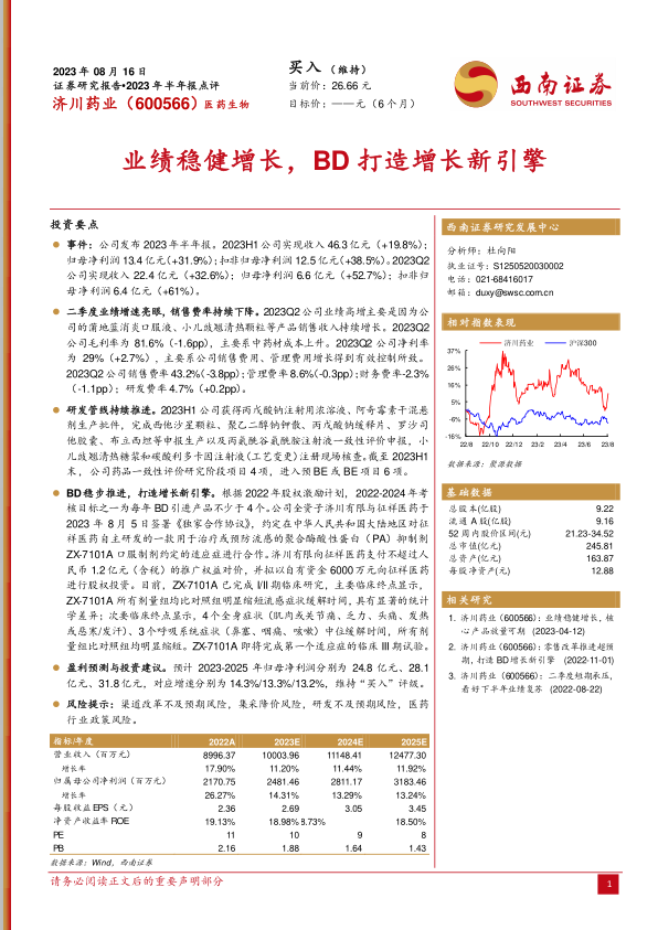 本报告对济川药业(600566)2023年半年报进行了深度分析,核心观点如下: