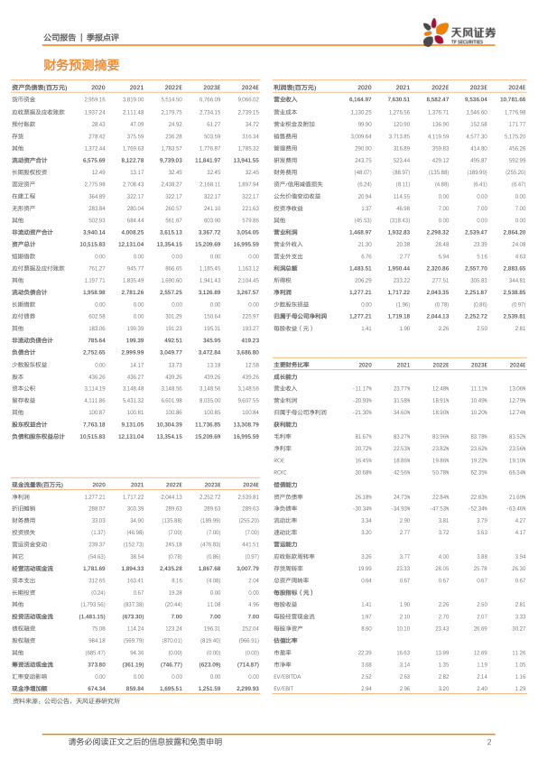 盈利预测:我们预计公司2022-2024年营业收入分别为85.82/95.36/107.82亿元,归母净利润分别为20.44/22.53/25.40亿元人民币,维持“买入”评级。