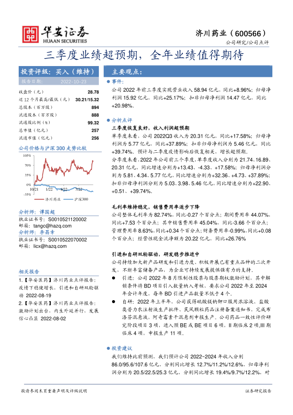 济川药业2022年前三季度业绩表现亮眼,三季度恢复良好,收入利润超预期。公司通过引进和自研双轮驱动,不断丰富产品储备,为可持续发展提供强有力的支持。维持此前盈利预测,并维持“买入”评级,但需关注产品销售、BD项目及生长激素研发等风险。