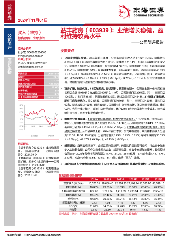 投资建议: 当前宏观环境下, 合规监管持续趋严, 药品比价压缩盈利空间, 行业竞争加剧步入加速整合期; 公司作为药店龙头企业, 经营韧性强, 市占率有望加速提升。我们预计公司2024-2026年归母净利润分别为17.40、 21.29、 25.84亿元, EPS分别是1.43、 1.76、2.13元,对应PE分别16.54、 13.52、 11.13倍。维持“买入”评级。