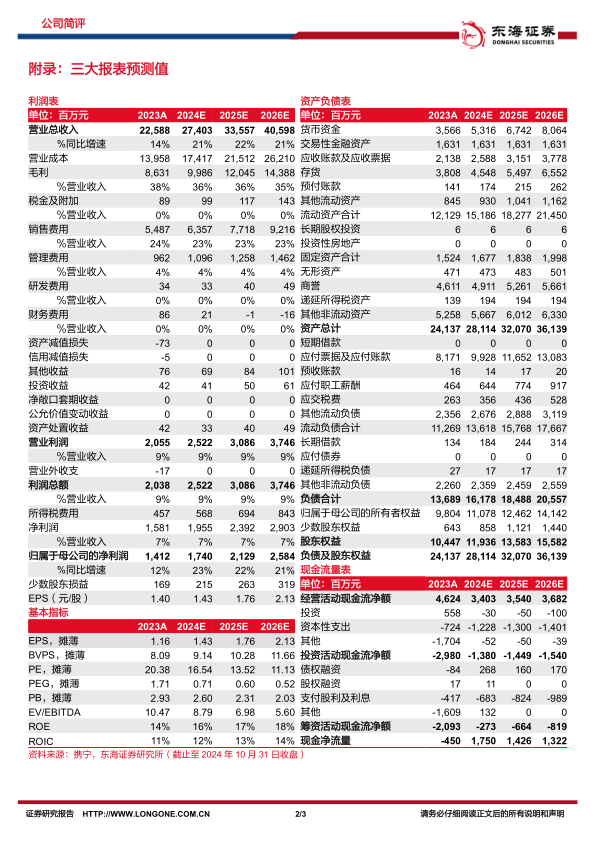 公司业绩增长稳健。 2024年前三季度, 公司实现营业收入达到172.19亿元,同比增长8.38%;归属于母公司的净利润为11.11亿元,同比增长11.14%;扣非归母净利润10.92亿元,同比增长13.01%; Q3单季度,公司营收54.56亿元,同比增加5.31%;归母净利润为3.13亿元,同比增加6.38%。 从盈利能力来看, 2024年前三季度,公司毛利率为40.39%( +0.84pct),净利率为6.96%( -0.14pct);期间费用率方面,公司销售、管理、财务费用率分别为25.99%( +0.48pct)、 4.39%( +0.12pct)、 0.71%( +0.31pct)。 公司业绩增长稳健,精细化管理下盈利能力维持在较高水平。