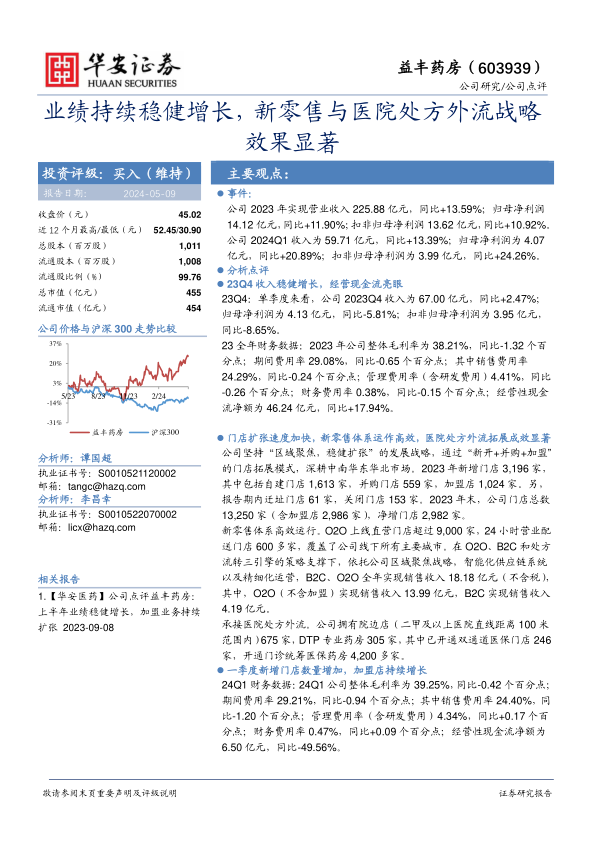 益丰药房2023年业绩表现稳健,2024年一季度延续增长态势。公司通过门店扩张、新零售业务发展和积极承接处方外流,实现了业绩的持续增长。维持“买入”评级,但需关注政策调整、处方外流规模以及药店扩张等风险因素。