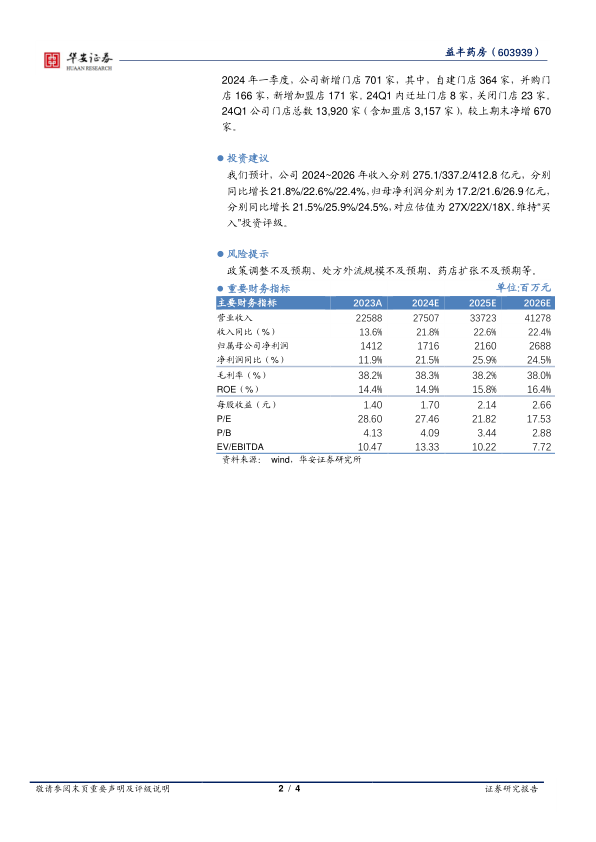 本报告对益丰药房(603939)2023年业绩及2024年一季度业绩进行了分析,并维持“买入”投资评级。