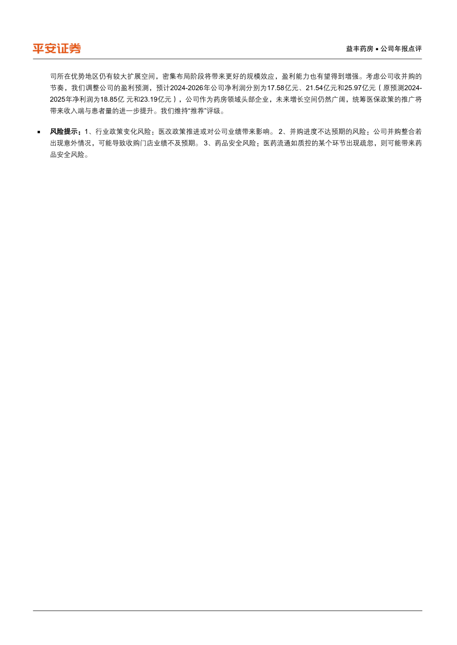 司所在优势地区仍有较大扩展空间,密集布局阶段将带来更好的规模效应,盈利能力也有望得到增强。考虑公司收并购的节奏,我们调整公司的盈利预测,预计2024-2026年公司净利润分别为17.58亿元、21.54亿元和25.97亿元(原预测2024-2025年净利润为18.85亿元和23.19亿元),公司作为药房领域头部企业,未来增长空间仍然广阔,统筹医保政策的推广将带来收入端与患者量的进一步提升。我们维持“推荐”评级。