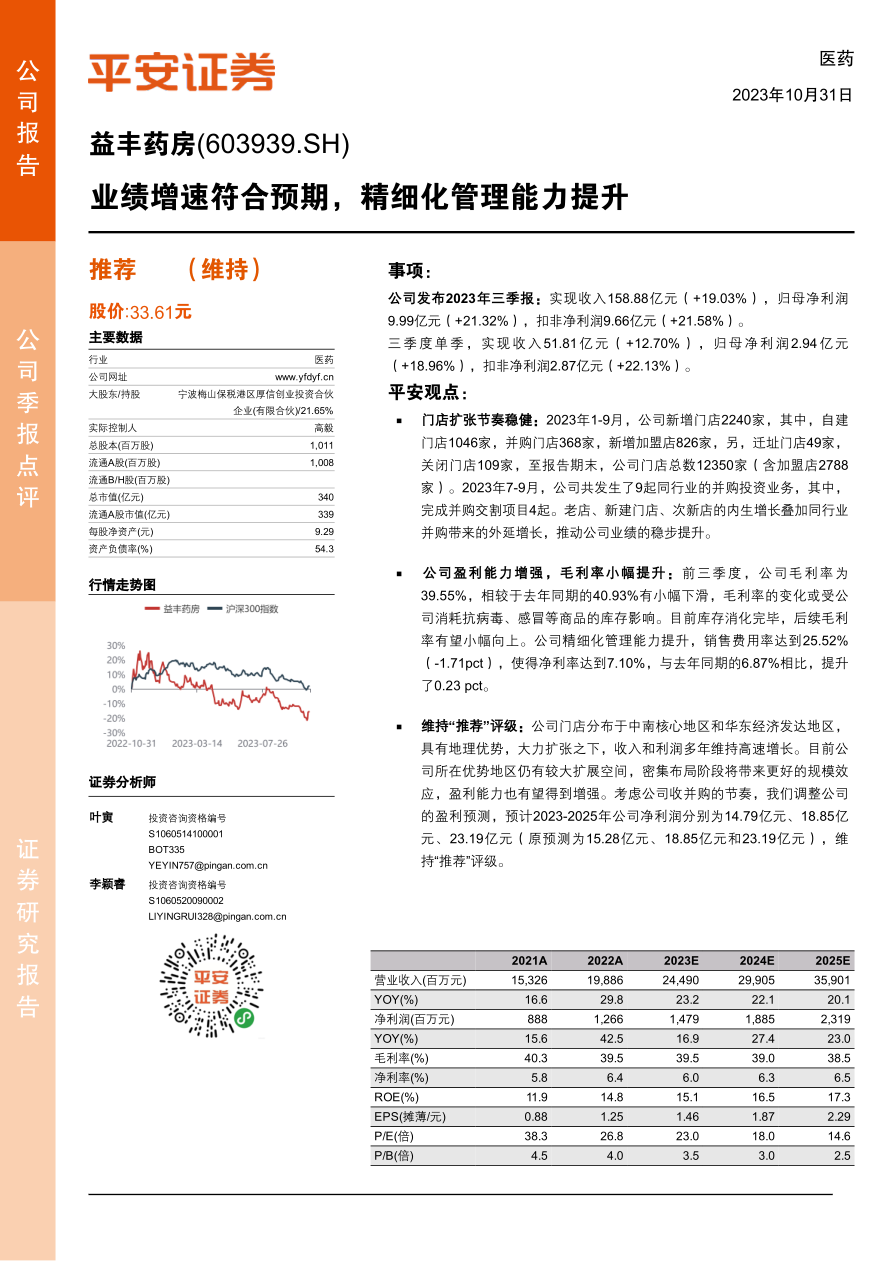 益丰药房在2023年前三季度展现出强劲的业绩增长势头,收入和归母净利润均实现双位数增长,符合市场预期。这主要得益于公司稳健的门店扩张策略,通过自建、并购和加盟多种方式持续扩大市场覆盖。同时,公司精细化管理能力的提升有效控制了销售费用,推动净利率上行,优化了整体盈利能力。尽管毛利率短期受库存消化影响,但预计未来将有所改善。平安证券维持“推荐”评级,并基于公司收并购节奏调整了未来三年的盈利预测,看好其在优势区域的扩张潜力及规模效应带来的盈利增长。投资者需关注行业政策变化、并购整合进度及药品安全等潜在风险。