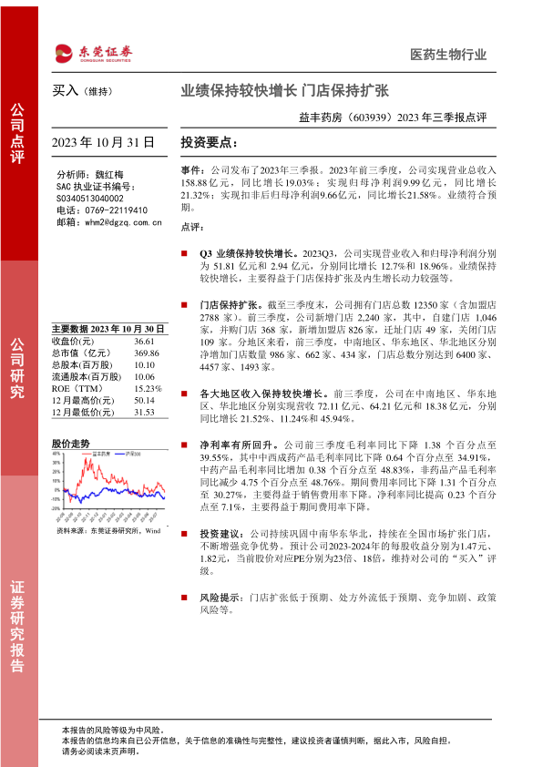 益丰药房2023年三季报显示公司业绩保持较快增长,门店扩张积极,区域布局不断优化。公司通过持续巩固中南、华东、华北市场,并在全国范围内扩张门店,不断增强竞争优势。维持“买入”评级,但需关注相关风险。