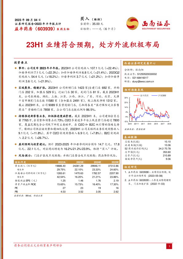 益丰药房在2023年上半年展现出卓越的经营韧性与增长潜力,其核心观点在于公司实现了营收和归母净利润均超过22%的显著增长。这一业绩不仅符合市场预期,更凸显了公司在当前医药零售市场竞争日益激烈的背景下,通过精细化管理和战略性布局所形成的强大盈利能力。具体而言,公司通过“区域聚焦、稳健扩张”的策略,持续优化其门店网络布局,上半年净增门店1312家,使得总门店数量达到11580家,有效扩大了市场覆盖范围。此外,公司对医保定点药店的高比例覆盖(86.5%)是其核心竞争力之一,这不仅有助于吸引医保患者,更在处方外流政策的推动下,为公司带来了稳定的客流和销售增长,从而为整体业绩的持续提升奠定了坚实的基础。