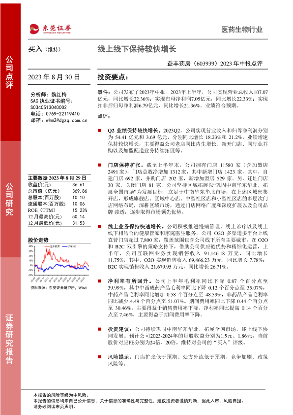 益丰药房2023年中报显示,公司业绩符合预期,主要增长动力来自于老店的内生增长、新开门店、并购以及加盟配送业务的拓展。