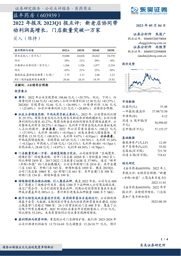 益丰药房2022年报及2023Q1报显示,公司业绩符合预期,营收和利润均实现稳健增长。这主要得益于新老门店的协同效应以及门店数量的持续扩张,公司门店总数已突破一万家。