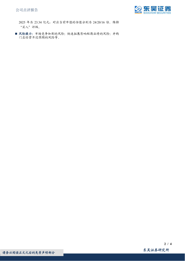 维持“买入”评级,但需关注市场竞争加剧、快速扩张影响短期业绩以及并购门店经营不达预期等风险。