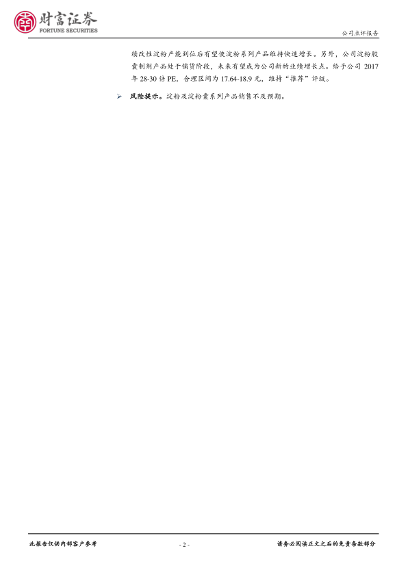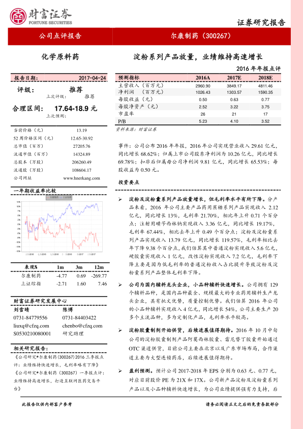 本报告对尔康制药2016年年报进行了点评,分析了公司业绩高速增长的原因,主要得益于淀粉及淀粉囊系列产品的放量和小品种辅料的快速增长。报告还指出,随着改性淀粉产能的到位和淀粉胶囊制剂产品的市场铺货,公司有望迎来新的业绩增长点。维持“推荐”评级,合理区间为17.64-18.9元。